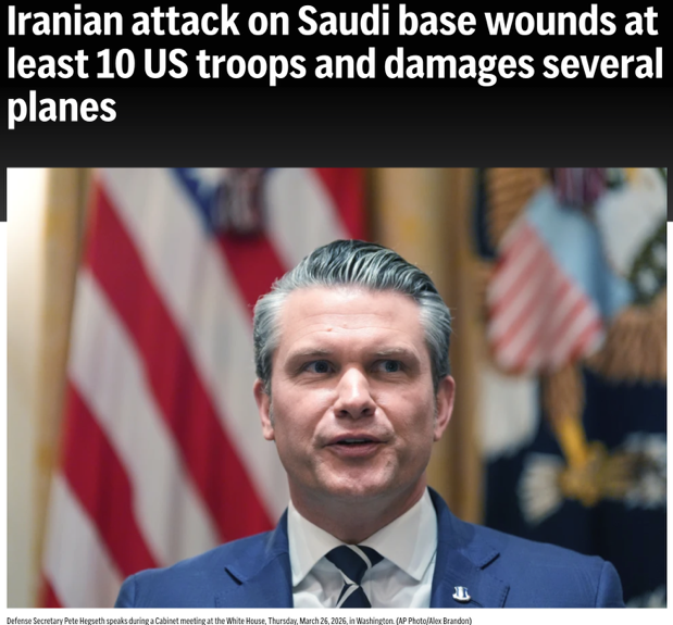 △美联社报道,伊朗袭击沙特军事基地,造成至少10名美军士兵受伤,并损坏数架飞机。