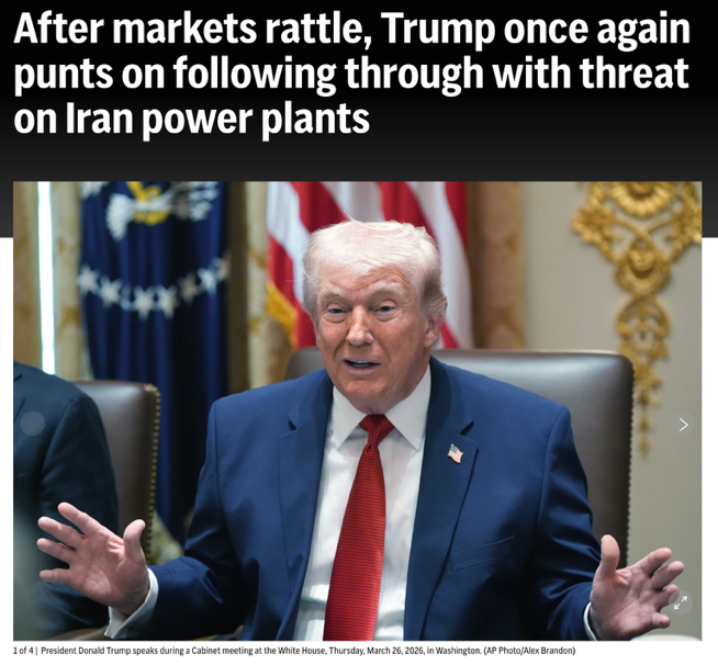 △美联社报道,面对股市动荡,特朗普总统再次宣布推迟打击伊朗能源设施,以为自己争取更多时间。