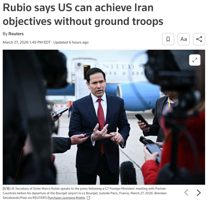 △路透社报道,国务卿鲁比奥表示,预计对伊行动在数周内结束,美国无需动用任何地面部队即可实现在伊朗的目标。