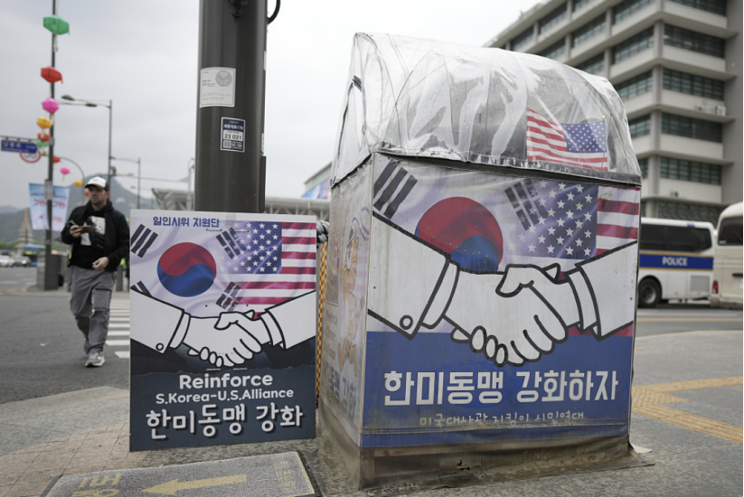 美国驻韩大使馆附近的“韩美同盟”横幅。